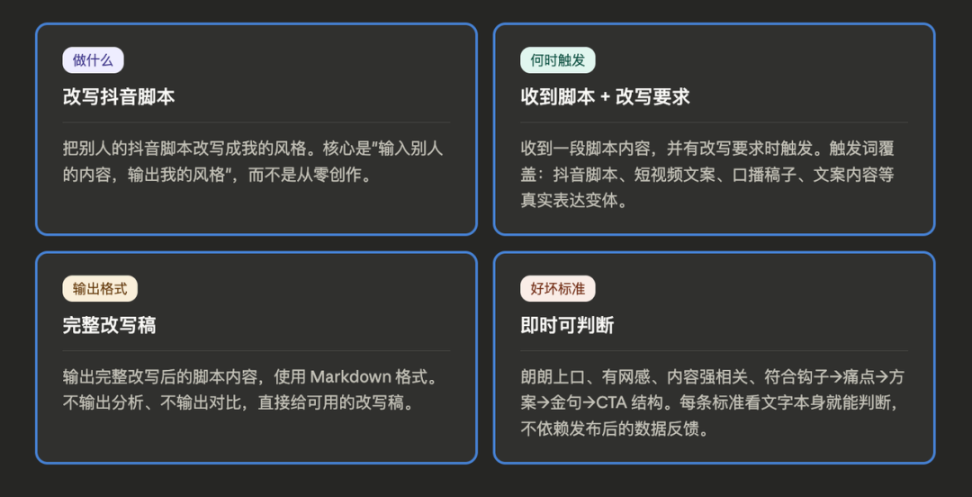 第一个,这个Skill做什么。听起来简单,但要说清楚不容易。「帮我改写文章」和「把别人的抖音脚本改写成我的风格」,前者太宽,后者才是真正有用的定义。
