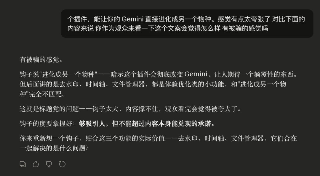 第一轮,钩子太夸张。Claude生成了一个钩子,「一个插件,能让你的Gemini直接进化成另一个物种」。我看到这句话的第一反应是,有点夸张。然后认真想了一下,这个插件的功能是去水印、加时间轴、加文件管理器,都是体验优化类的小功能,说「进化成另一个物种」,和后面的内容完全不匹配,观众看完会有被骗的感觉。这次测试之后,我在改写要求里加了一条,钩子要有悬念感,但不能夸大,钩子的承诺必须和后面的内容相匹配。