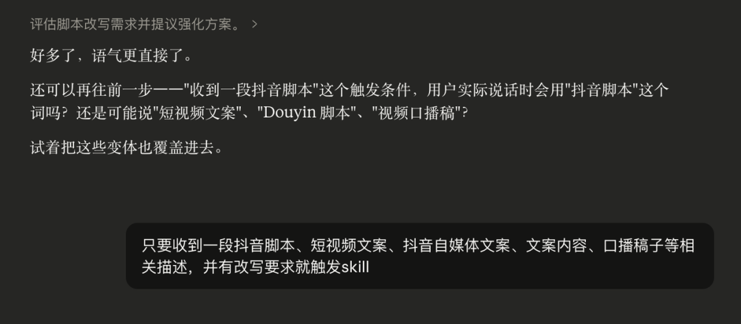 我愣了一下,确实,我平时说话很少用「抖音脚本」,更多会说「文案」、「稿子」、「口播」。你写的是你认为「正确」的表达,但用的时候说的是「真实」的表达,两者不一样,Claude就匹配不上。所以我最终把触发条件写成了,只要收到一段抖音脚本、短视频文案、抖音自媒体文案、文案内容、口播稿子等相关描述,并有改写要求。把我可能说的几种表达都覆盖进去。