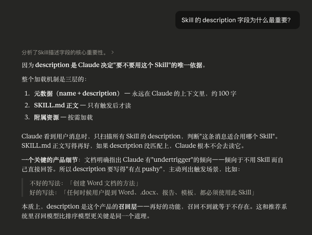 所以Skill里最关键的,不是那几百行的操作指令,而是那不到一百个字的description。