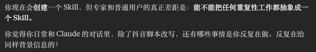 我平时做抖音视频,看到好的视频文案,经常让Claude帮我改写成自己的风格。原来的做法是,在同一个窗口里,每次把相同的提示词重复发给它,这是一个典型的、蠢蠢的重复性动作。Skill解决的就是这件事,把你每次都要重复说的话,固化成一个文件,让Claude一直记着。