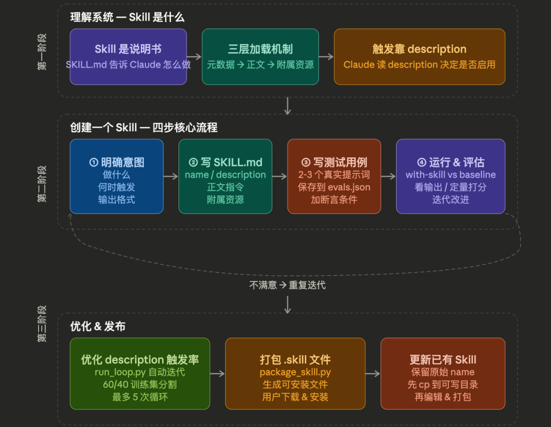 找到那个场景,回答四个问题,做什么、何时触发、输出格式、好坏标准。然后打开Claude,把这四个答案告诉它,让它帮你整理成SKILL.md,上传,测试,迭代。