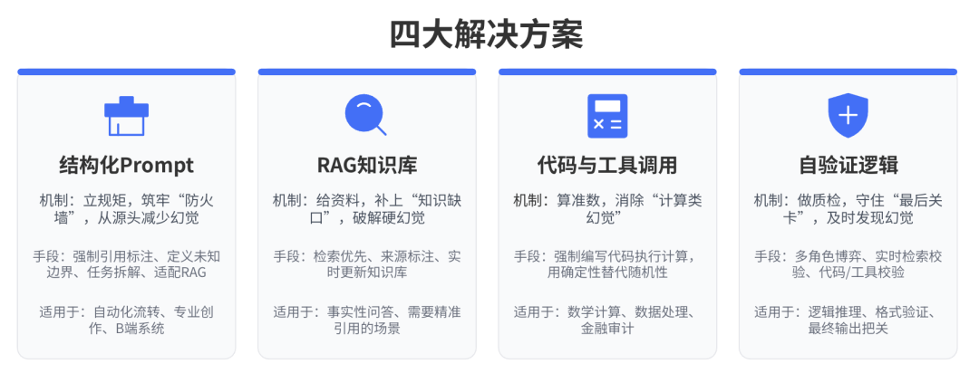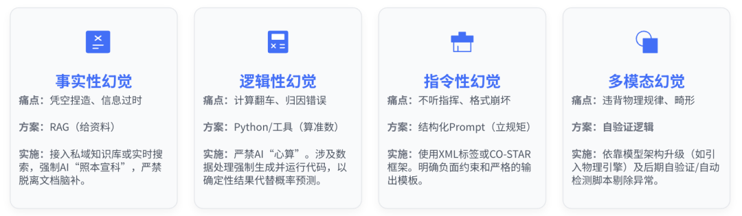 在了解了AI幻觉产生的原因之后,我们就可以针对不同的幻觉类型,采取针对性解决方案。