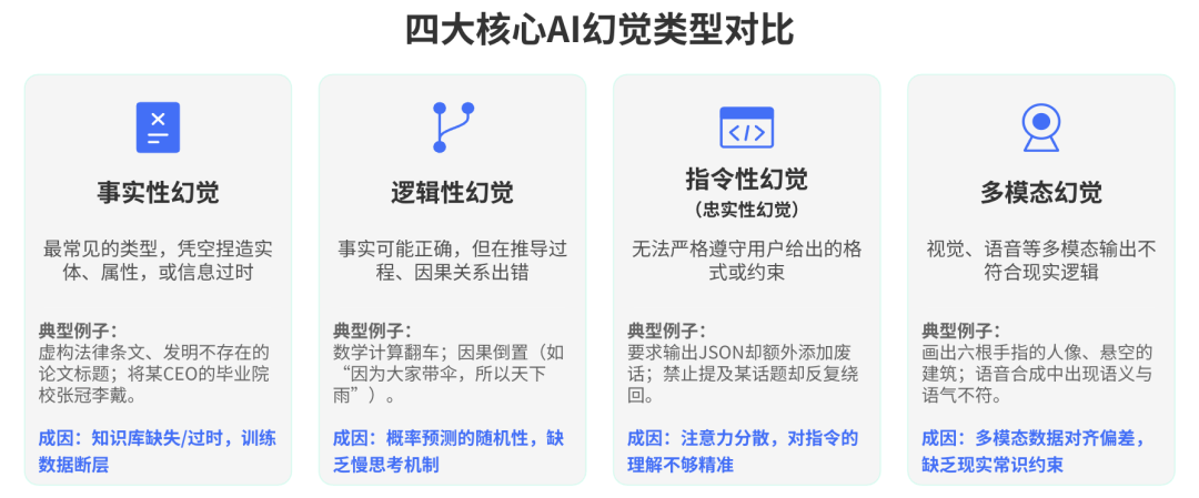 从表现形式来看,AI 幻觉(Hallucination)主要可以分为以下4 大类:事实性幻觉(准不准)、逻辑性幻觉(对不对)、指令性幻觉/忠实性幻觉(听不听话)、多模态幻觉(像不像)。