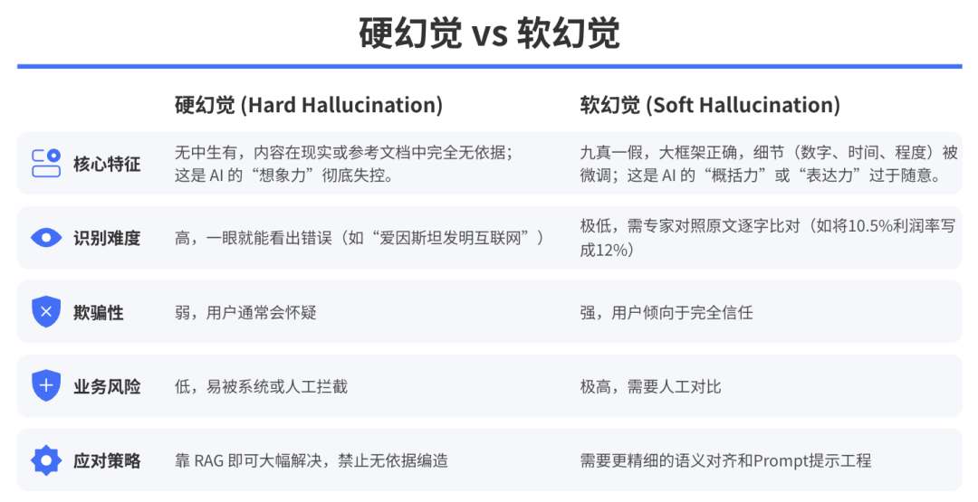 虽然“硬幻觉”听起来更离谱,但在实际业务场景中,“软幻觉”往往更危险、后果更严重。