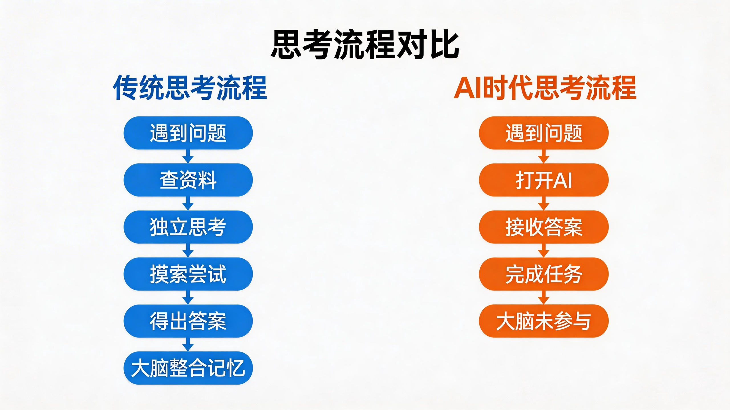 以前你遇到一个问题,你会怎么做?查资料、问人、自己想、碰壁、再想、慢慢拼出一个答案。这个过程很慢,有时候让人抓狂,但你的大脑全程在工作。