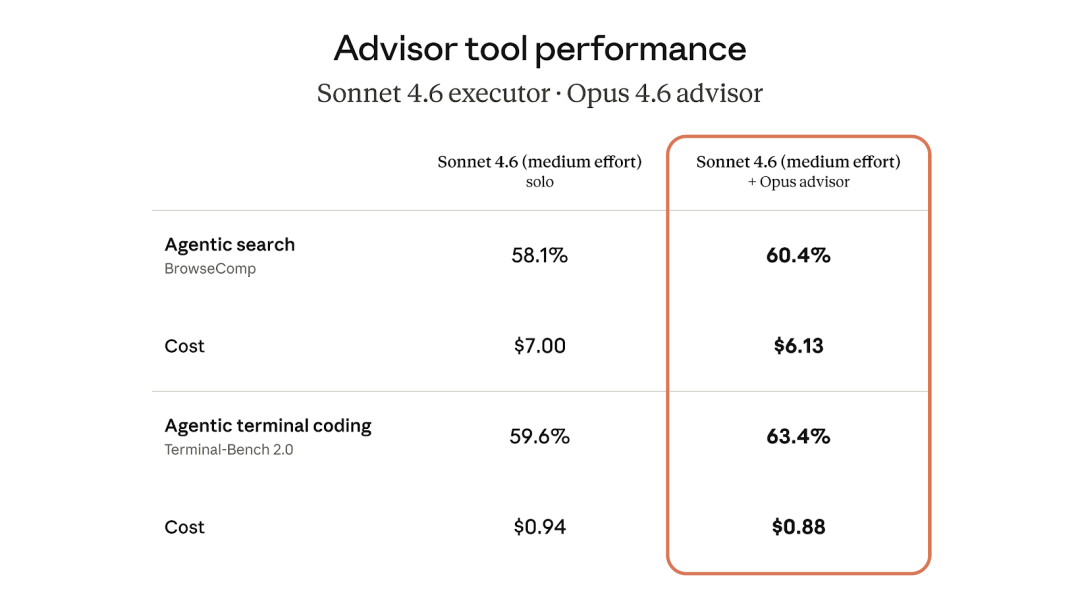 在 BrowseComp 和 Terminal-Bench 2.0 上,Sonnet + Advisor 同样超过了 Sonnet 单独跑,而且每个任务的成本更低