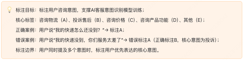 - 撰写标注示例:针对每个标签,提供3-5个优质标注示例(正确案例+错误案例),帮助标注员快速理解标准;