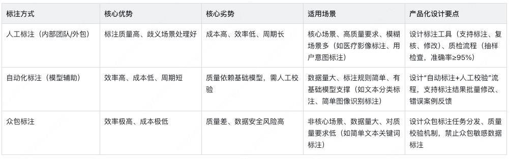 不同场景适配不同标注方式,产品经理需结合“标注质量要求、成本预算、项目周期”选择最优方式,常见标注方式对比如下: