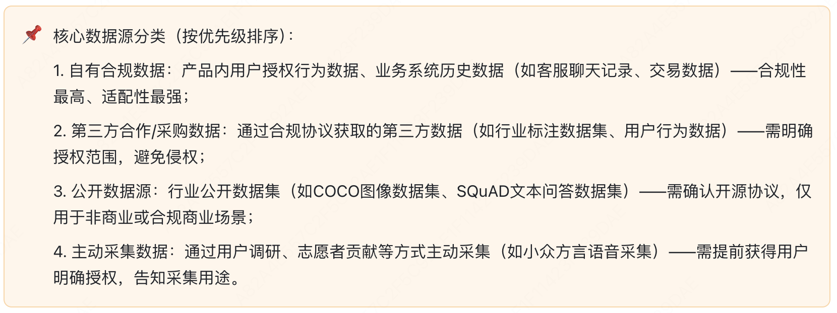 采集范围(采集什么):围绕模型需求与业务场景,明确核心数据字段与数据类型,拒绝“冗余采集”。示例(AI客服产品):核心采集用户咨询话术(文本)、用户意图标签(分类数据)、咨询时间(时间数据),无需采集用户无关行为(如浏览历史);