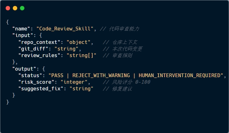 但在Agentic Workflow下,页面被剥离了,我必须把这个环节抽象成一个纯粹的Code_Review.skill。作为AI PM,你不需要再纠结按钮放在左边还是右边,你需要定义的是高度结构化的输入与输出约束。在实际工作流中,Code_Review.skill 的触发并非被动等待。主 Agent 会持续监听代码仓库的事件流:当它检测到一条指向主干分支的Pull Request被标记为Ready for Review,且该 PR 的关联 CI 流水线已全部通过时,才会自动拉起这个 Skill。若 PR 仍处于Draft状态,或流水线存在失败项,主 Agent 会直接跳过,避免将不成熟的代码变更引入审查链路。这种精确的触发条件设计,是保证整个自动化工作流”不乱跑”的第一道门槛。而一旦触发条件成立,skill 本身的能力边界就需要被严格定义。作为AI PM,你需要设计的是这样一份Schema: