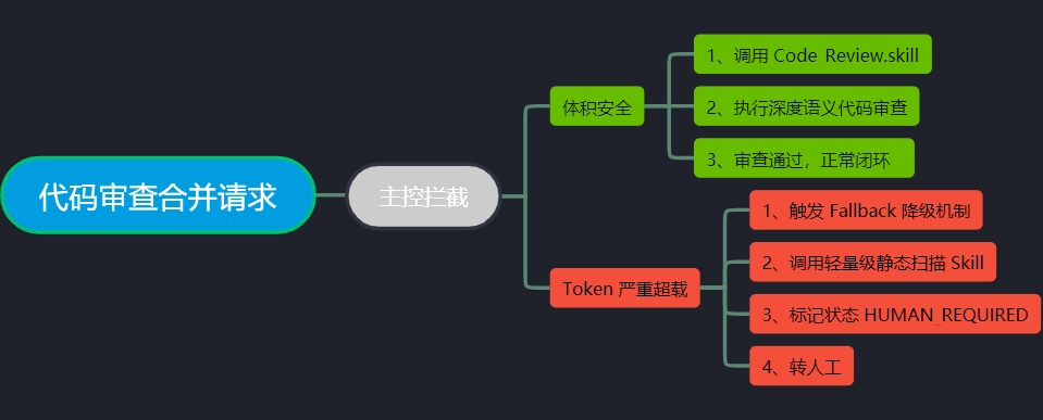 当git_diff体积超过安全阈值时,主Agent必须触发降级机制:不再调用大模型进行深度语义审查,而是转而调用一个基于传统静态扫描工具的轻量级Skill,同时将 status 强制标记为HUMAN_INTERVENTION_REQUIRED,直接将任务抛给资深架构师进行人工介入。