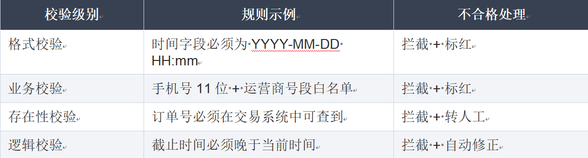 规则引擎是整个系统稳定性的核心。再好的模型,输出也需要校验层兜底。我们的校验规则分三级: