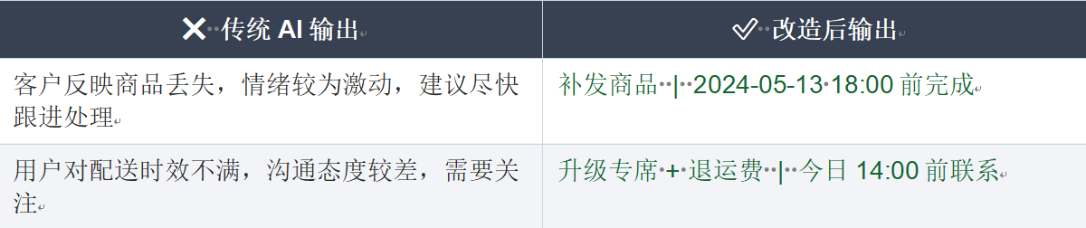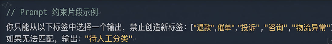 只允许AI从已有标签库中命中分类(退款 / 催单 / 投诉 / 咨询 / 物流异常),禁止创造新标签。
