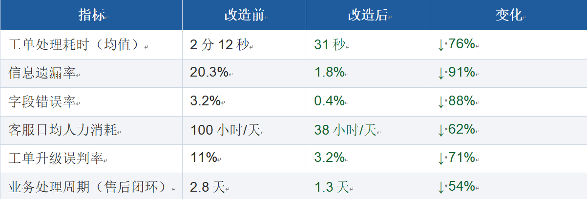 一个真实落地项目:某头部电商平台售后客服中心,日均工单量超过8万条,将AI引入工单自动生成环节后,平均处理时长从2分钟压缩到30秒,信息遗漏率从20%降至1.8%,每日节省人力约62小时。