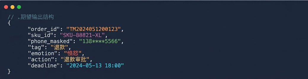 强制抽取三项核心字段:订单号(order_id)、SKU编码(sku_id)、用户手机号(phone_masked)。输出结构严格定义为JSON,缺字段直接拦截。