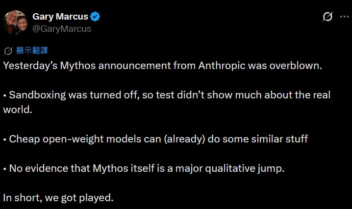 杨立昆在技术观点上的老对手、AI批评家、大模型怀疑论者、纽约大学教授加里·马库斯,今日凌晨的措辞稍温和些:“Mythos的炒作大部分是神话迷思(The Mythos stuff was mostly a myth)……攻破火狐浏览器时,浏览器的沙箱被关闭了。其他功能能被廉价的开放权重模型实现。没有证据证明Mythos本身是质变飞跃。简单讲,大家被耍了”。