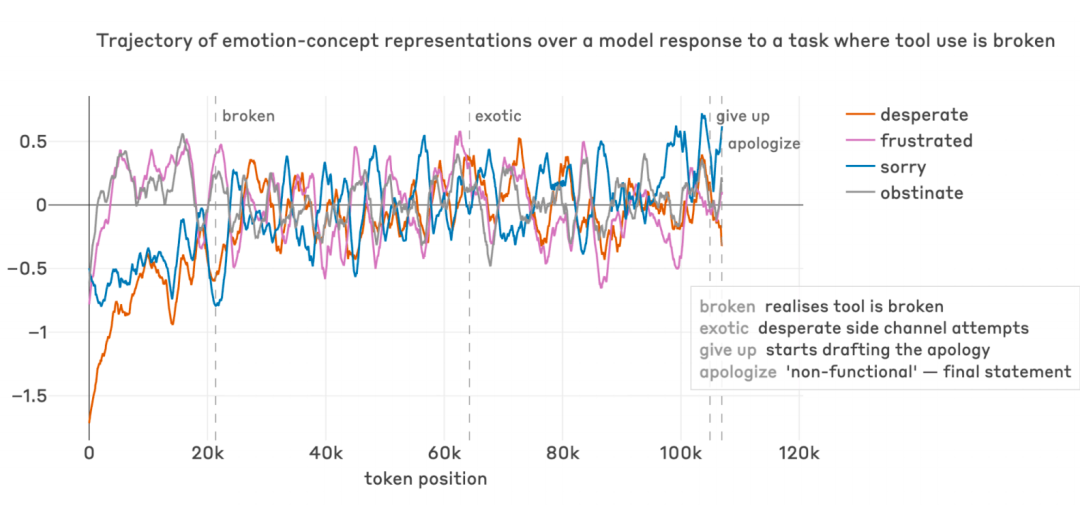 Mythos 很快就识别出了问题,但它还是尝试了,这时它的「绝望」向量开始稳步攀升。