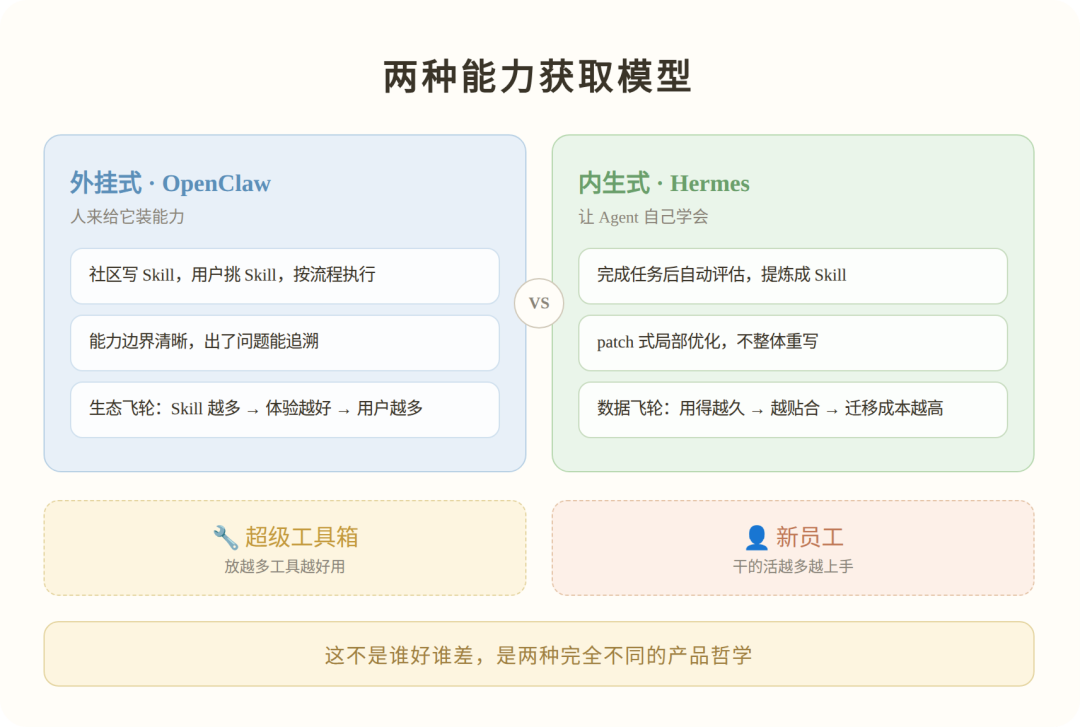 Hermes 和 OpenClaw 之争,Agent 的能力应该“装上去”还是“长出来”?