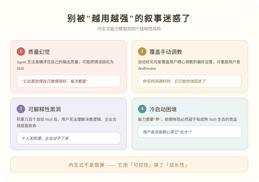 当一个 Agent 积累了几百个自动生成的 Skill 后,用户还能理解它为什么做出某个决策吗?在个人用途上无所谓,你觉得它好用就行。但在企业场景下,这几乎是致命的。一个不能解释自己行为的 Agent,在合规层面就过不了关。