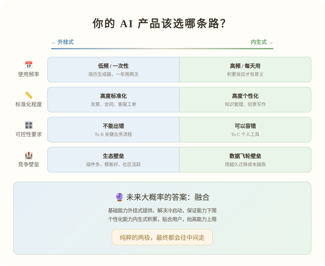 如果你让我下一个判断,我认为未来大概率是两种模式的融合。基础能力外挂式提供,解决冷启动问题,保证能力下限;个性化能力内生式积累,让产品随着使用时间越来越贴合用户,抬高能力上限。