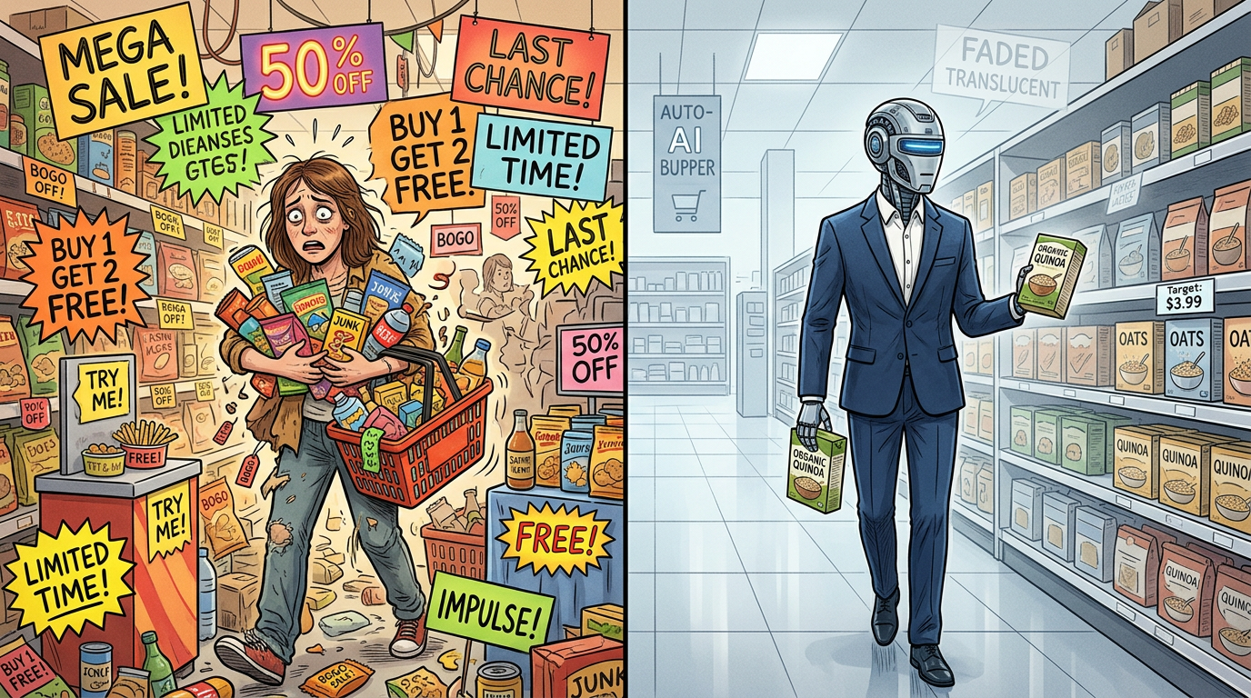 想象你雇了一个超级靠谱的管家,每周让他替你去超市采购。这个管家走进超市,对端架陈列视而不见,对试吃台冷漠路过,对「限时五折」的红色大牌子毫无反应,对收银台前那一排让你忍不住顺手抓的口香糖完全免疫。他直奔目标货架,扫一眼成分表,挑出最便宜且达标的那个,付款走人,全程四分钟。