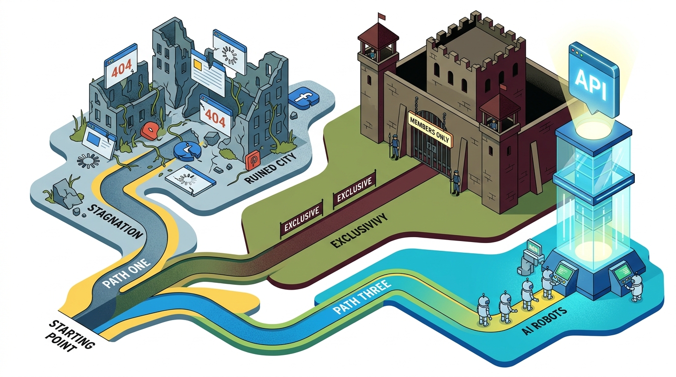 如果上面的逻辑成立,那么接下来的两到五年里,内容生产者会被强制分流到三条路上。这三条路决定了哪些产品形态会死、哪些会活、哪些是新机会。