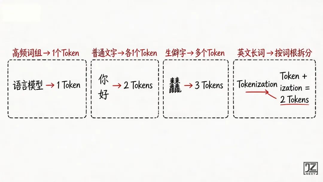 - 但“语言模型”这四个字,在 AI 训练语料里大量捆绑出现,分词器大概率会直接把它打包成 1 个 Token。