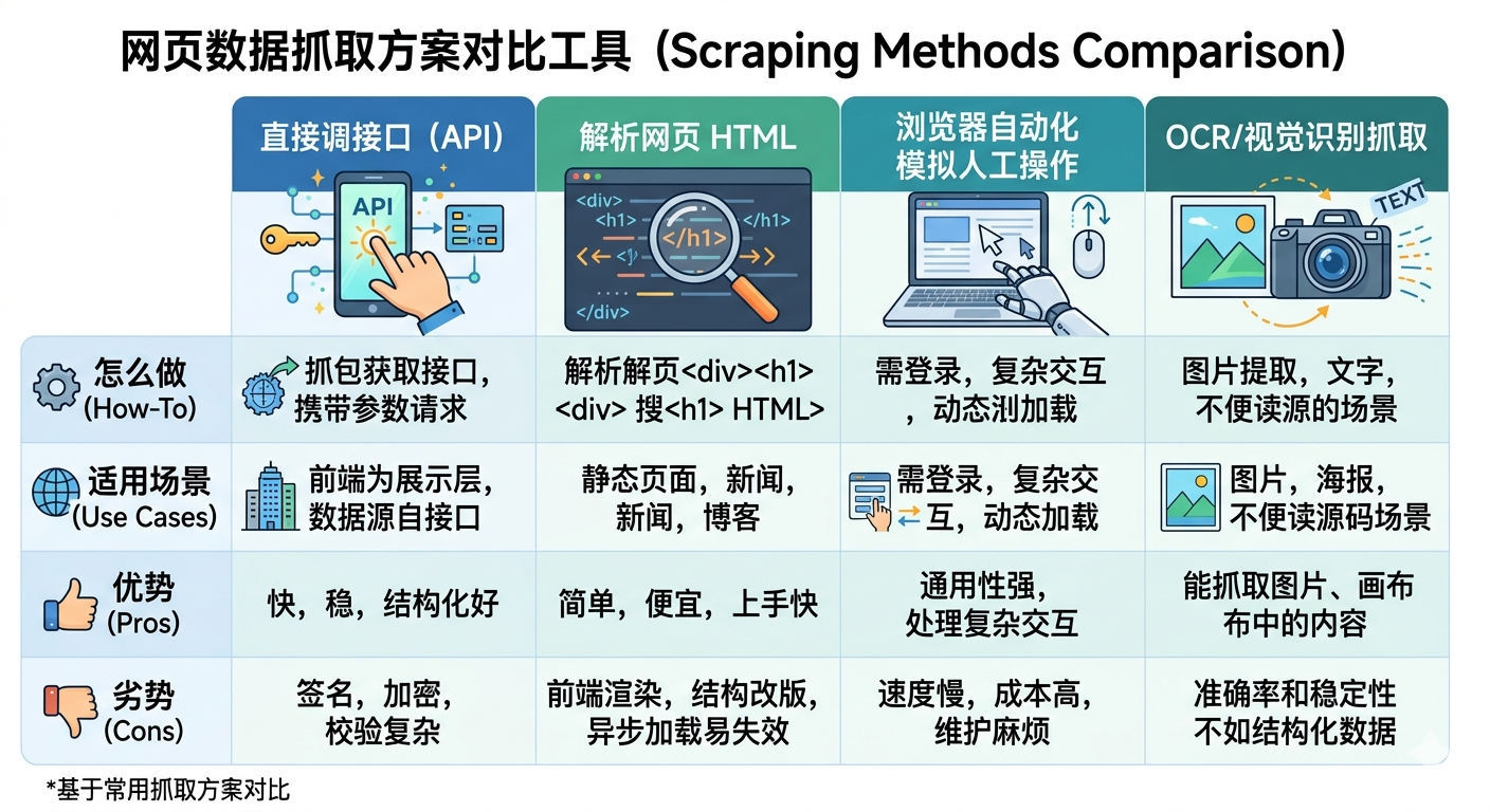 页面是给人看的,API是给机器用的。让AI模拟鼠标点击读页面文字,本质上是在用最慢的方式访问数据。后来改成直接从前端页面的网络请求里提取接口返回的原始数据,速度和准确度都上了一个台阶,风控触发也大幅降低。