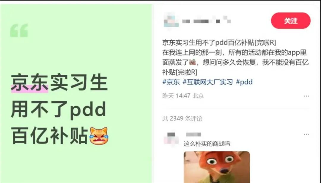 近日,一位京东实习生在社交平台吐槽,称自己连上公司网络后,拼多多里的百亿补贴功能凭空消失了,帖子末尾还不忘问一句“什么时候能恢复”。