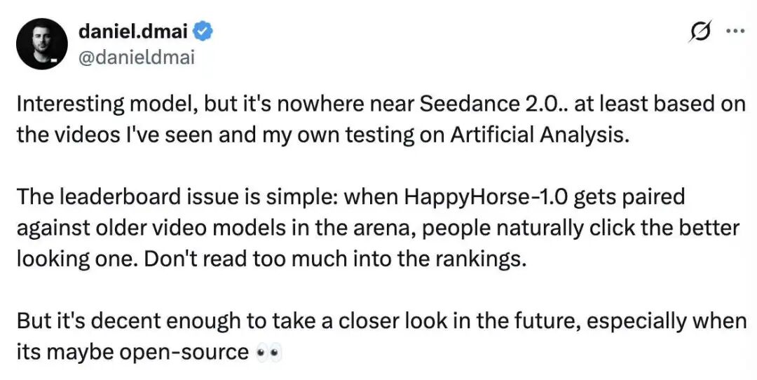X用户daniel.dmai更是直言不讳:“别把排名太当回事。当HappyHorse碰到的都是些旧模型时,大家自然会选那个看起来更顺眼的。它跟 Seedance2.0比还差得远。”
