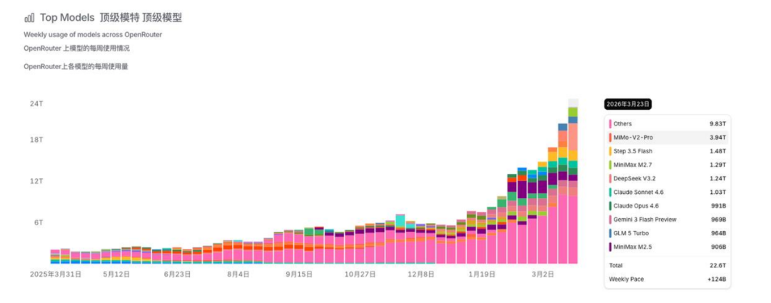 全球大模型聚合路由平台OpenRouter数据显示,中国大模型的单周调用量已连续一个月超过海外模型,调用量位于前列的都是国产模型,比如小米、阶跃星辰、Minimax等。