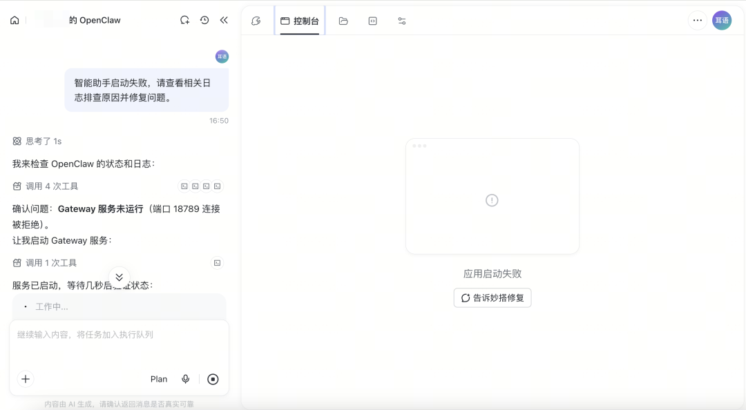 ArkClaw和WorkBuddy遇到配置问题,直接在Claw内部对话就能解决。但妙搭不行,它有一个专属的AI机器人来处理环境配置问题,而这个机器人有单独的免费额度和收费规则——免费次数只有20次,用完要额外付费。