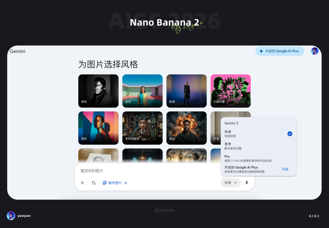 这里并不会显示模型版本,但是默认 Nano Banana 2 是快速模式,所以把模式切换成 Fast 即可