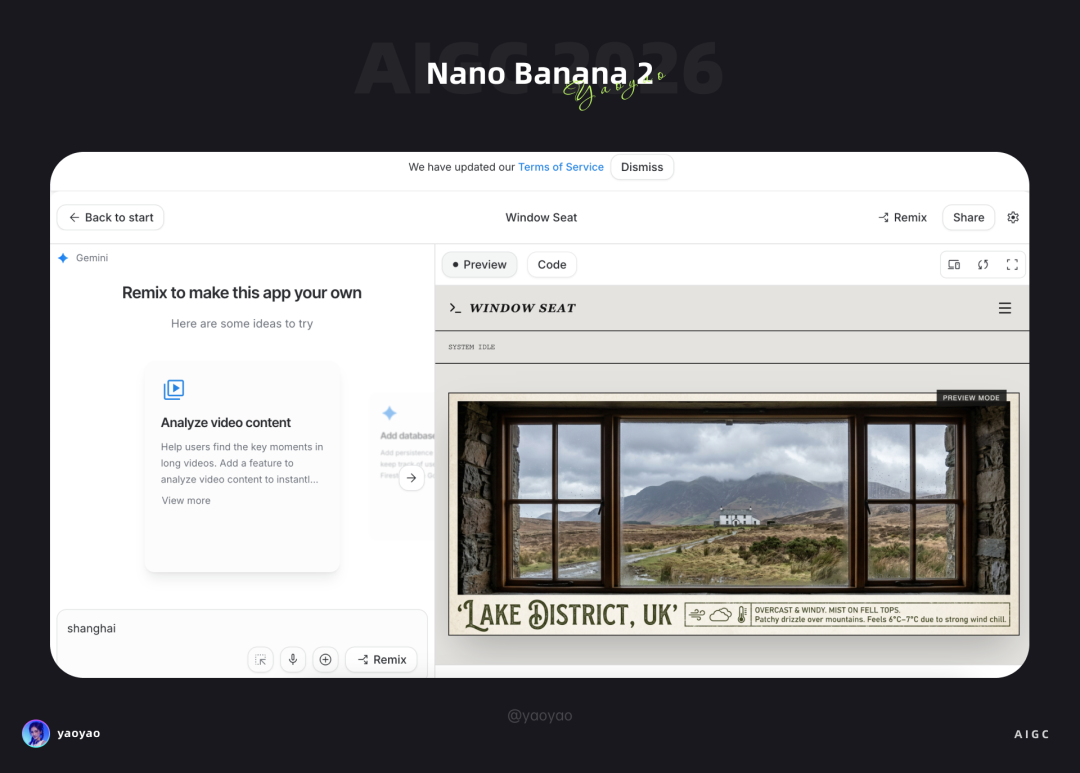 从世界上的某一扇窗看城市天气Google 官方针对 Nano Banana 2 的发布,还提供了另一个热门的小工具,「Window Seat 窗户边的座位」,可以输入城市名字,具体的景点,调用获取天气的工具,自动生成一张从窗户外预览风景的照片。