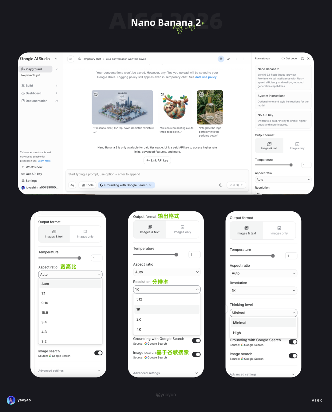 进入 AI Studio,在左侧模型选择器里找到 Nano Banana 2(gemini-3.1-flash-image-preview)。 右侧面板可以直接配置参数:
