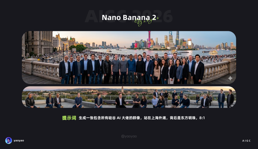 提示词:生成一张包含所有硅谷 AI 大佬的群像,站在上海外滩,背后是东方明珠,8:1
