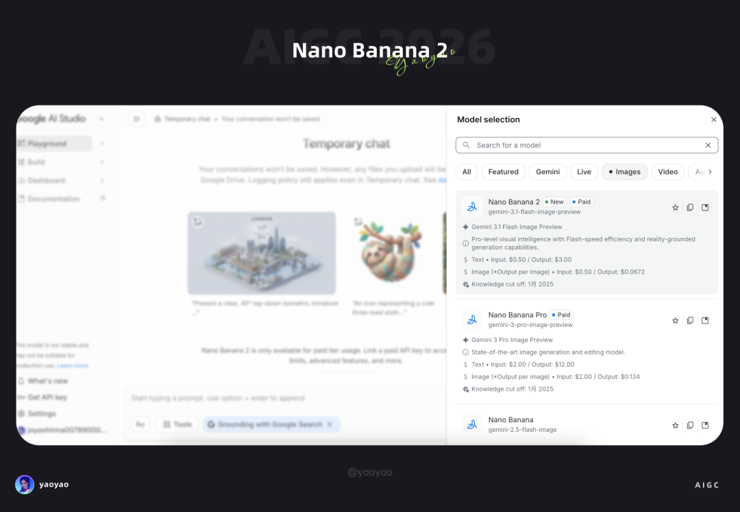 在 AI Studio 上能看到两款模型的具体情况,Nano Banana 2 使用 Gemini 3.1 Flash,而 Pro 则是 Gemini 3 Pro。
