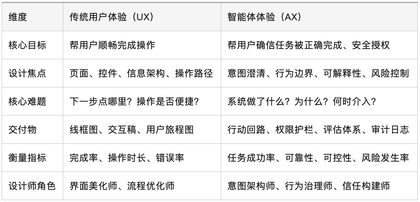从表格中可以看出,UX聚焦“人与界面的交互”,AX聚焦“人与智能体的协同”;UX追求“高效操作”,AX追求“可信执行”。