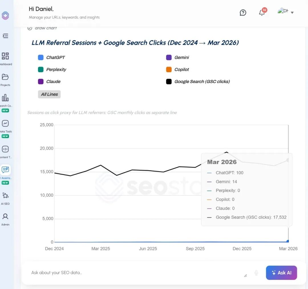 Mar 2026 实际数据:ChatGPT 引流 100 个会话,Gemini 14 个,其余平台为 0——相比之下,Google 搜索带来 17,532 次点击