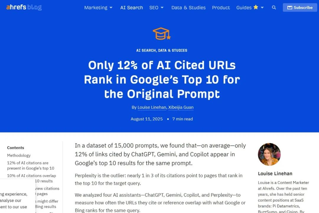 Ahrefs 研究:在 15,000 条提示词数据集中,仅有 12% 的 AI 引用 URL 出现在 Google 同一查询前 10 名——LLM 确实在从不同的内容池中引用
