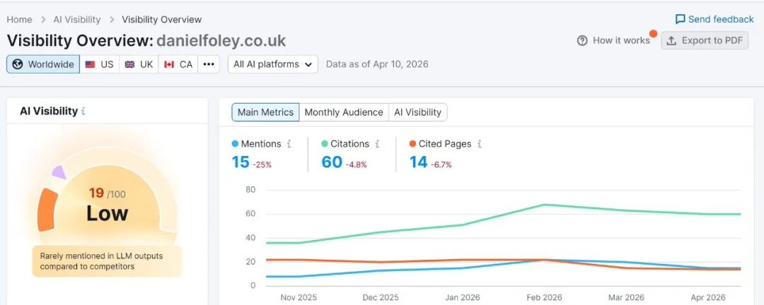 GEO 可见度追踪工具:danielfoley.co.uk 的 AI 可见度评分为 19/100(低),Mentions: 15,Citations: 60——这个数字意味着什么?没有基准,无从判断