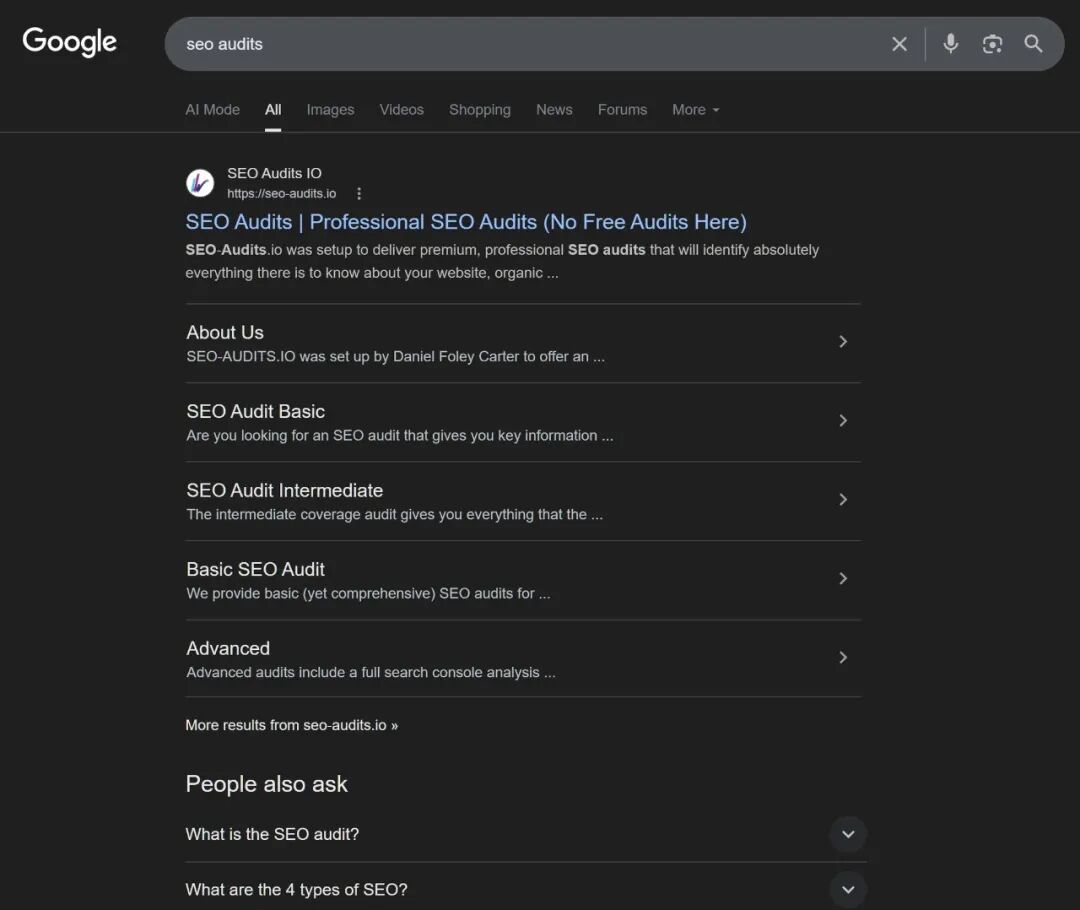 Google 搜索”seo audits”,精确匹配域名 seo-audits.io 排名第一——十年前宣告消亡的策略,至今依然有效