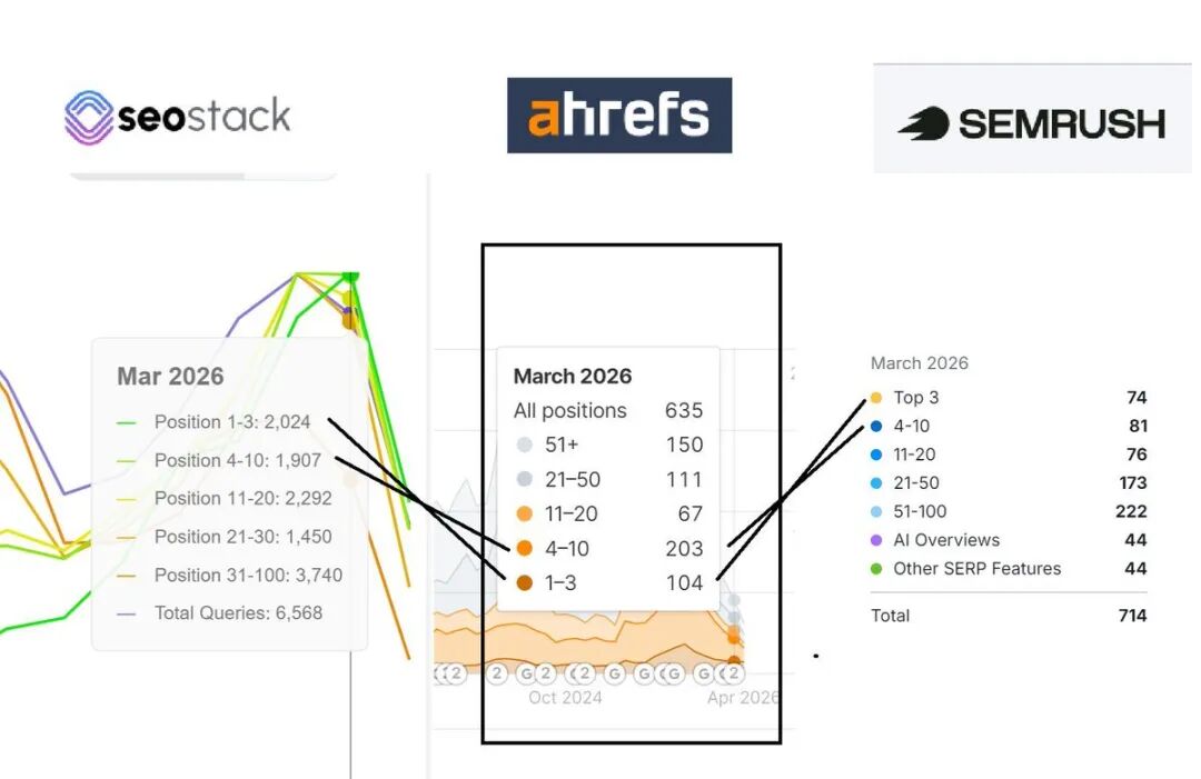 同一网站,SEO Stack 识别出 6,568 个关键词,Ahrefs 只识别到 635 个,SEMrush 仅识别到 714 个——最大的工具也只是在捕捞部分数据