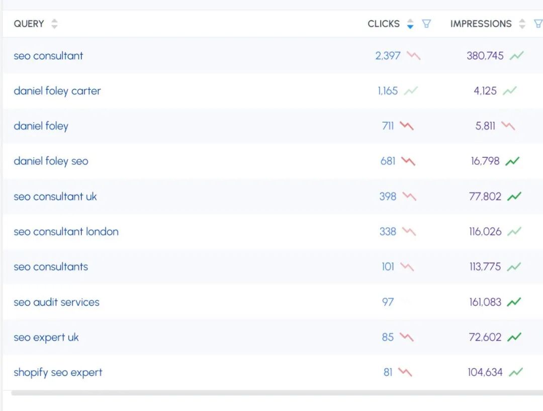 Google Search Console 数据:关键词”seo consultant”每月带来 2,397 次点击和超过 38 万次曝光——传统关键词追踪建立在真实、可重复的搜索量之上