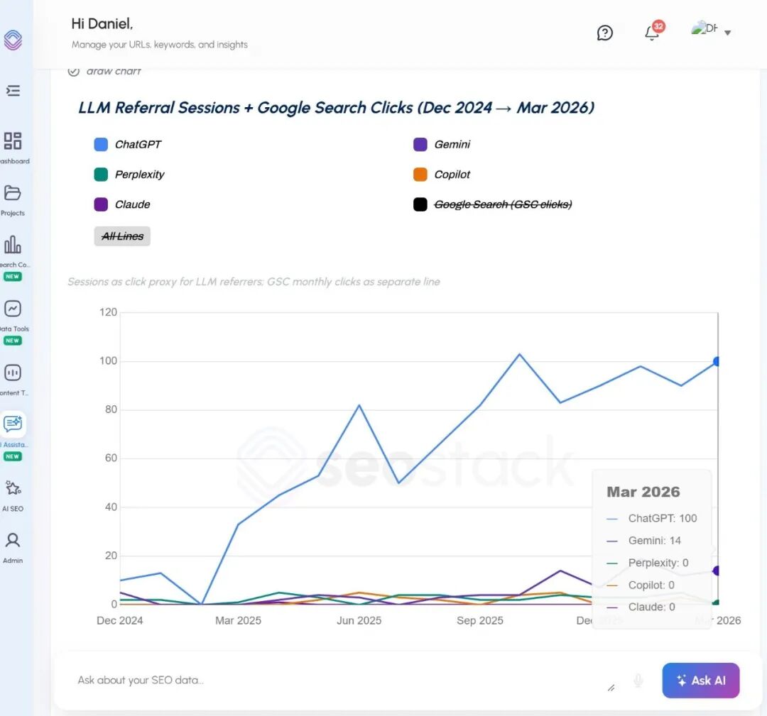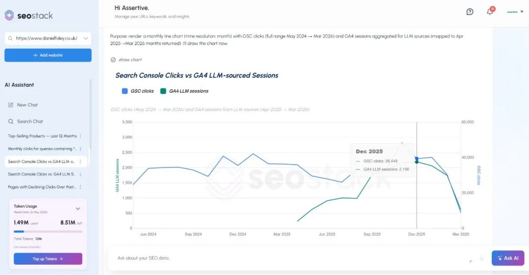 SEO Stack 将 GSC 点击与 LLM 来源会话并排呈现:Dec 2025 时,GSC 点击 39,449 次 vs LLM 会话 2,196 次——比例已经悬殊