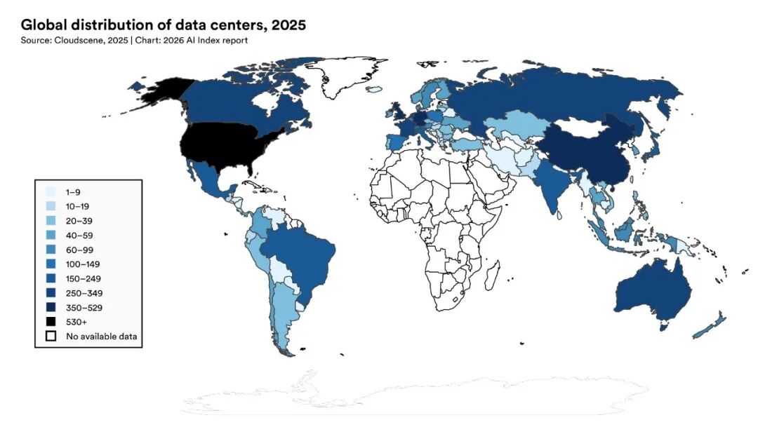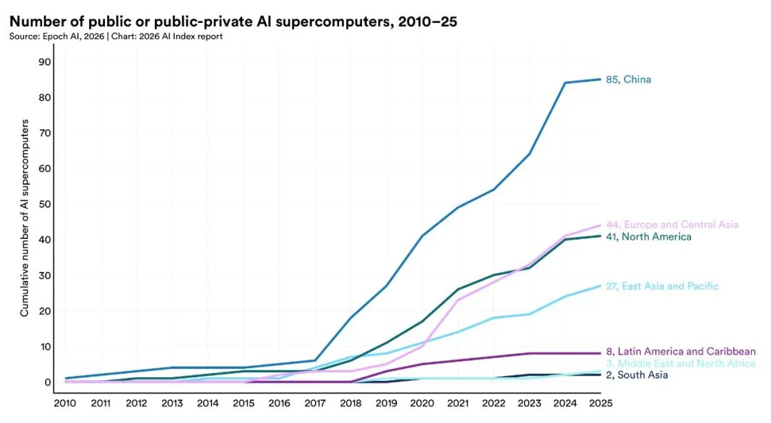 今年报告新增了 AI 主权分析框架,覆盖基础设施主权、数据主权、模型主权、应用主权和人才主权五个维度。国家支持的 AI 超算集群:中国以 85 个领先。 欧洲/中亚 44 个,北美 41 个。南亚 2 个,拉美 3 个,中东北非 8 个