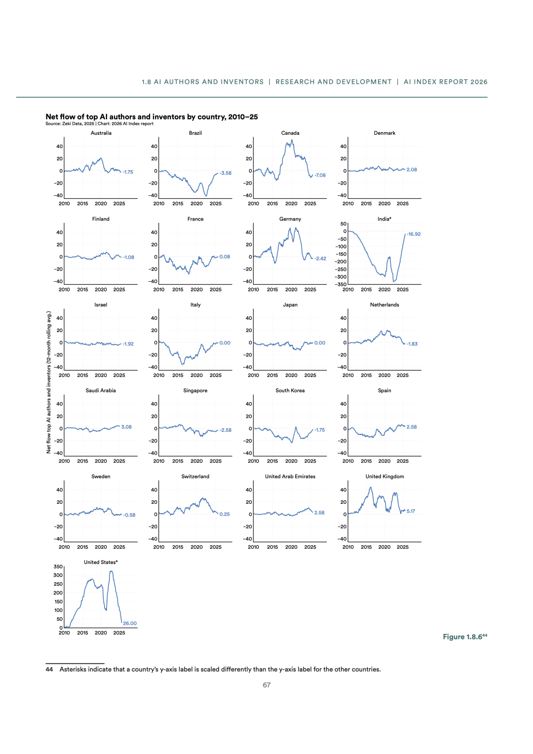 美国仍然是全球 AI 人才最多的国家(220,520 人),但净流入在急剧下降:从 2022 年的峰值 324.6 降到 2025 年的 26.0,不足顶峰 1 成。迁入美国的 AI 研究者数量自 2017 年以来下降了 89%。瑞士和新加坡在人均 AI 研究者和开发者数量上全球领先。性别差距 15 年来没有变化,各国女性比例在 18%-32% 之间