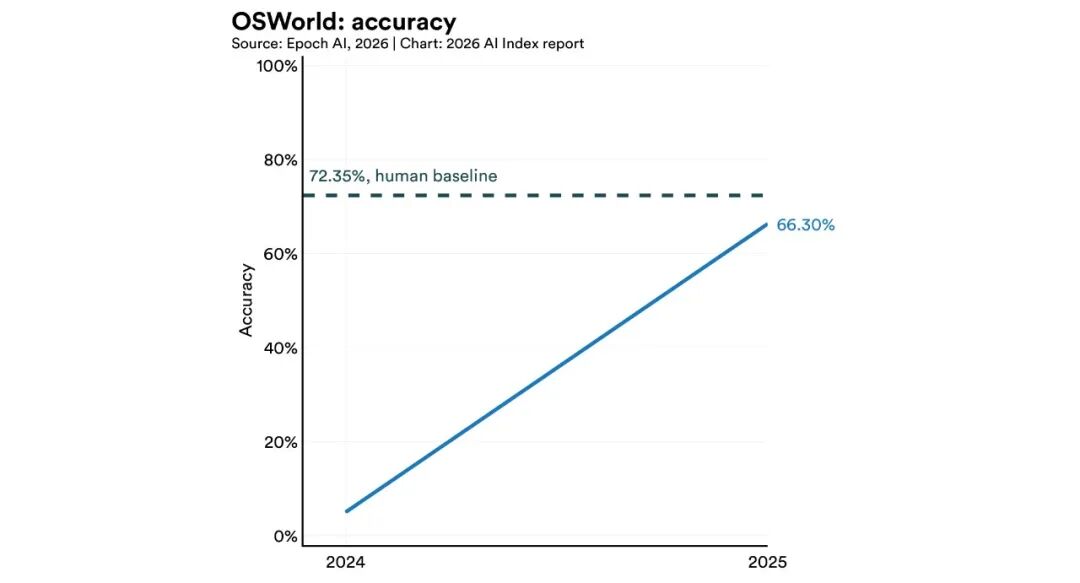 4. AI 能拿 IMO 金牌但看不准时钟,研究者称之为「锯齿边界」。 Gemini Deep Think 在国际数学奥赛拿了金牌(35 分),但最强模型看模拟时钟的准确率只有 50.1%。AI Agent 在 OSWorld 上从 12% 跳到约 66%,但每 3 次结构化测试还是会失败 1 次