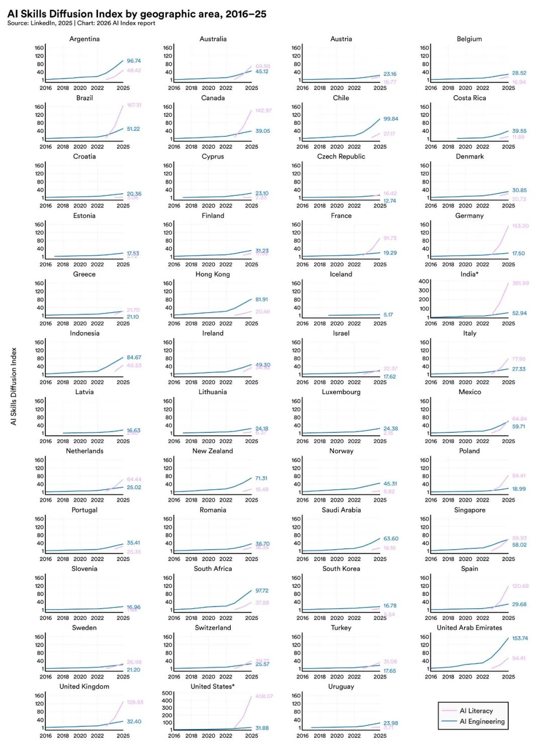 各国 AI 技能扩散指数 2016-2025